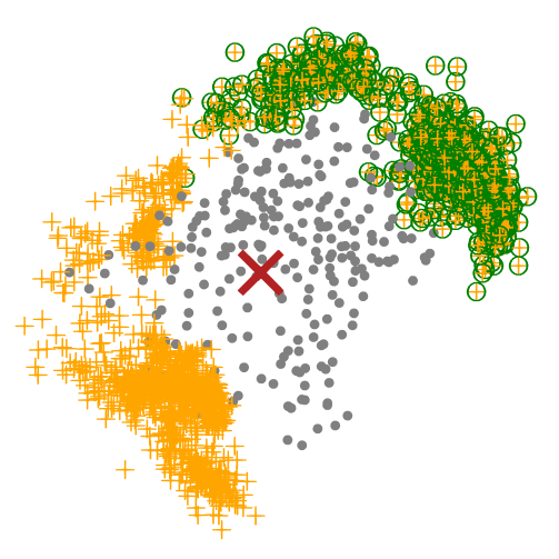 At this moment, we could perform a filtering step after we get all potential binder backbones. For example, I only want backbones (orange cross) in one side (green circle). We could remove other useless backbones, which can help a lot in reducing the computation stress.