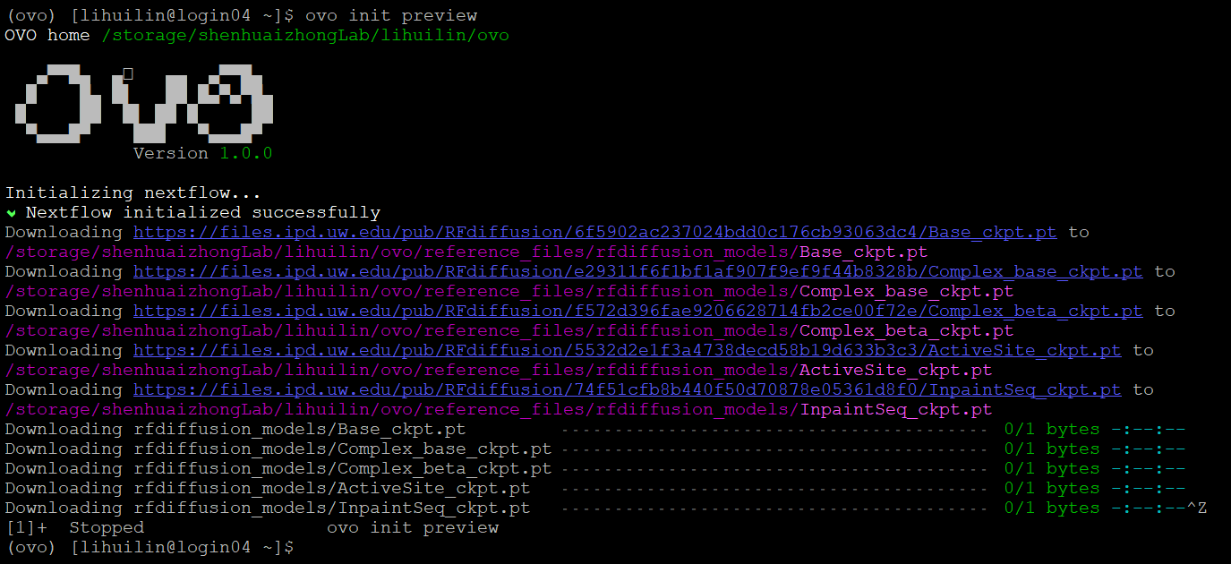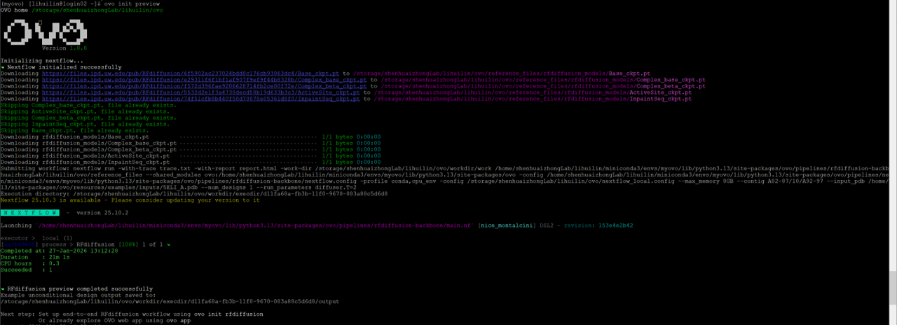 ovo init preview requires internet accession and CPUs\(\ge\)4 simultaneously. In my practice, the login node can access internet, but only have 1 CPU. In this case, we can modify /home/shenhuaizhongLab/lihuilin/miniconda3/envs/myovo/lib/python3.13/site-packages/ovo/pipelines/rfdiffusion-backbone/main.nf file by changing cpus 4 to cpus 1 (line 11) and memory "16 GB" to memory "8 GB" (line 12).