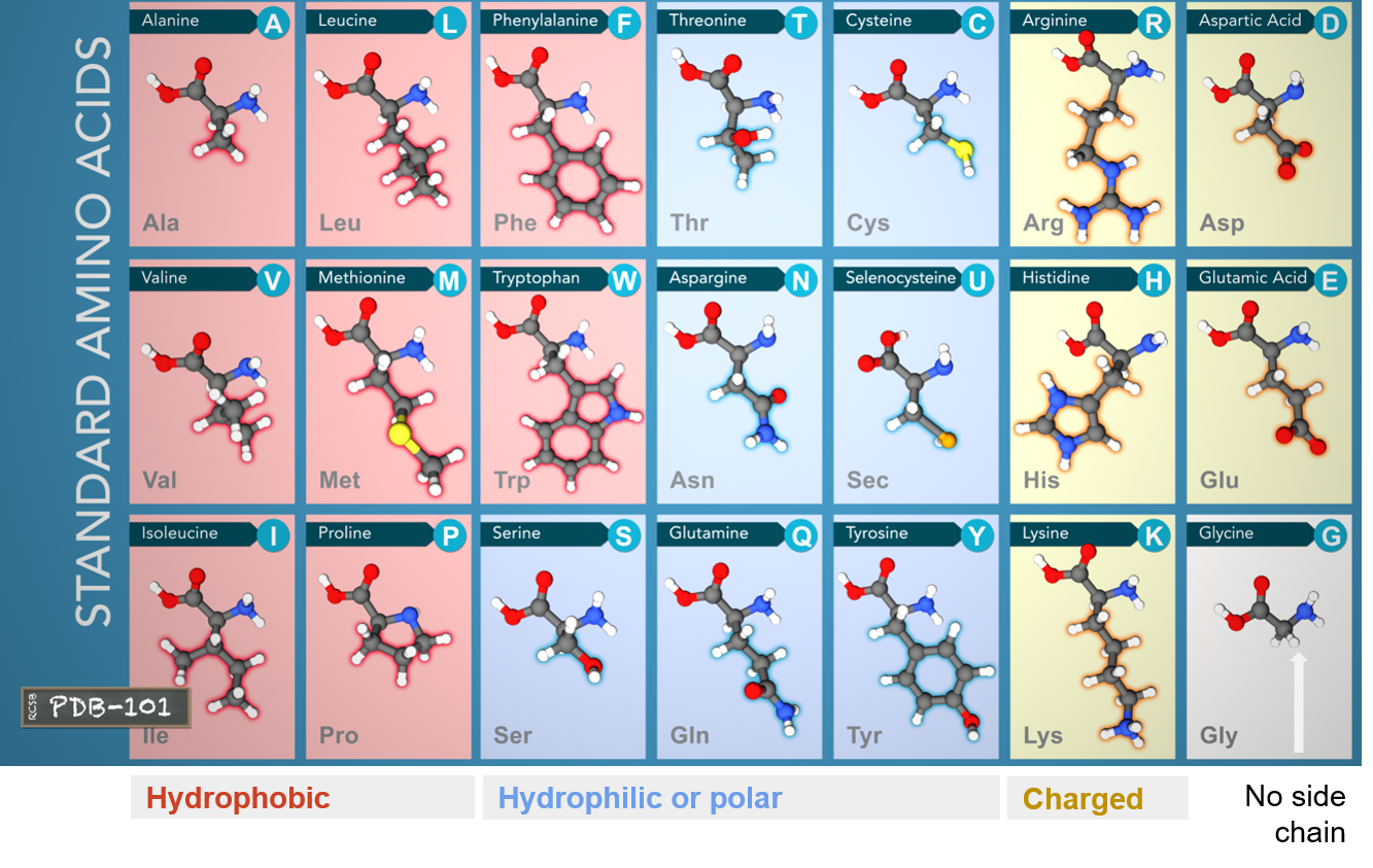 - Hydrophobic: carbon-rich side chains which don't interact well with water.